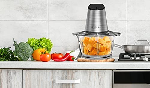 The Daewoo StainlessSteel food chopper has a powerful 500W motor and 4 sharp stainlesssteel blades which let you to crush onions, slice salad ingredients, meats, sauces or puree soups quickly and easily. Just press the button and hold it. Your food will be chopped in seconds